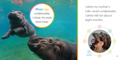 A baby hippopotamus narrates the story of its life, describing how physical features, diet, habitat, and familial relationships play a role in its growth and development.