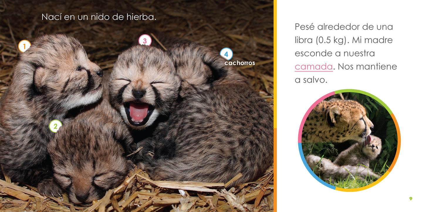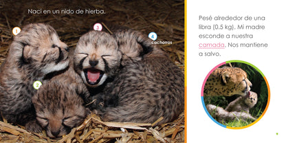 A baby cheetah narrates the story of its life, describing how physical features, diet, habitat, and familial relationships play a role in its growth and development.