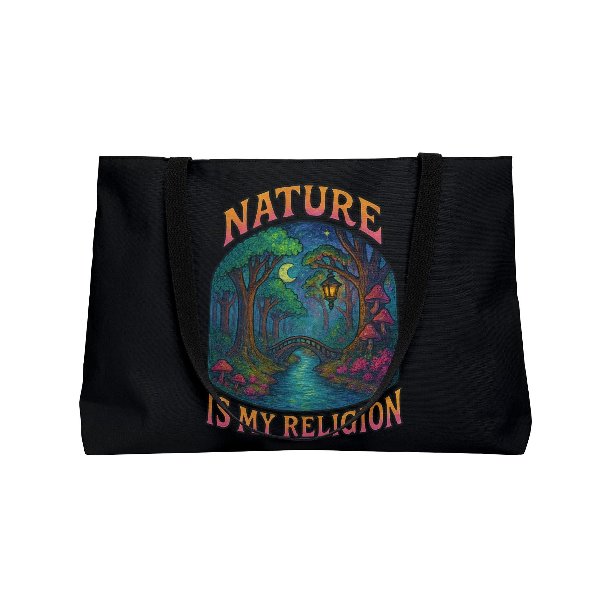Carry your essentials with sacred style in the Nature is My Religion tote bag. Featuring a dreamy, hand-painted woodland scene of glowing mushrooms, moonlit trees, and a winding path, this tote celebrates the forest as a temple and the Earth as altar.