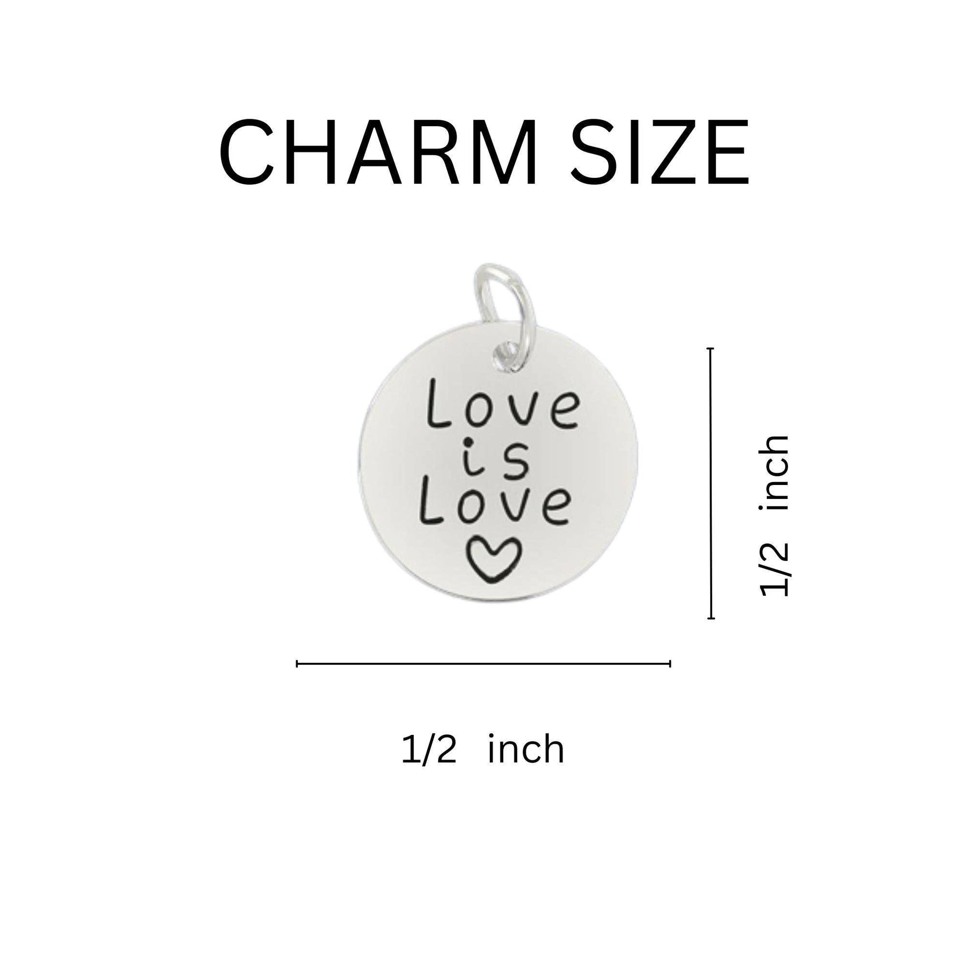 These rainbow heart retractable charm bracelets have a 3/4 inch by 3/4 inch rainbow heart charm and a 1/2 inch circle charm that says Love is Love.
