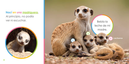 A baby meerkat narrates the story of its life, describing how physical features, diet, habitat, and familial relationships play a role in its growth and development.