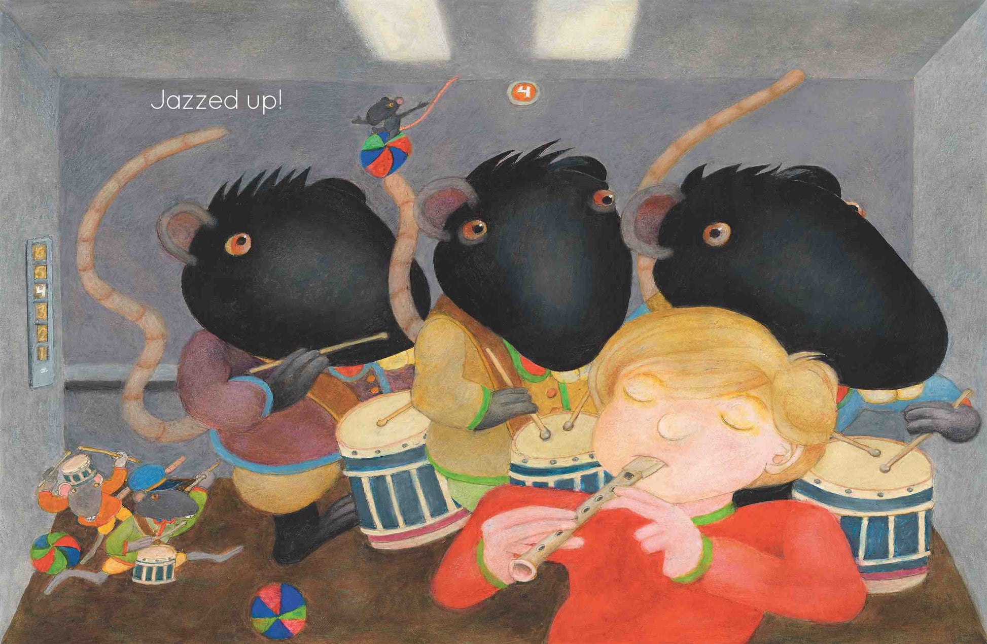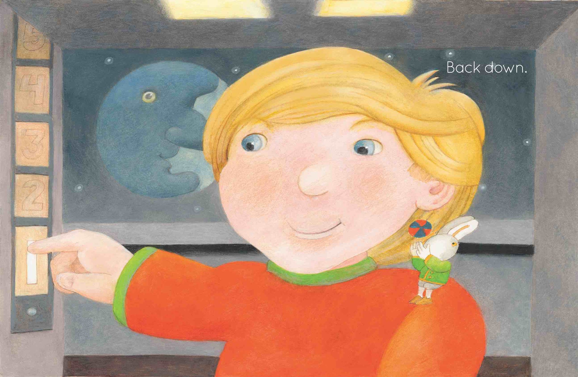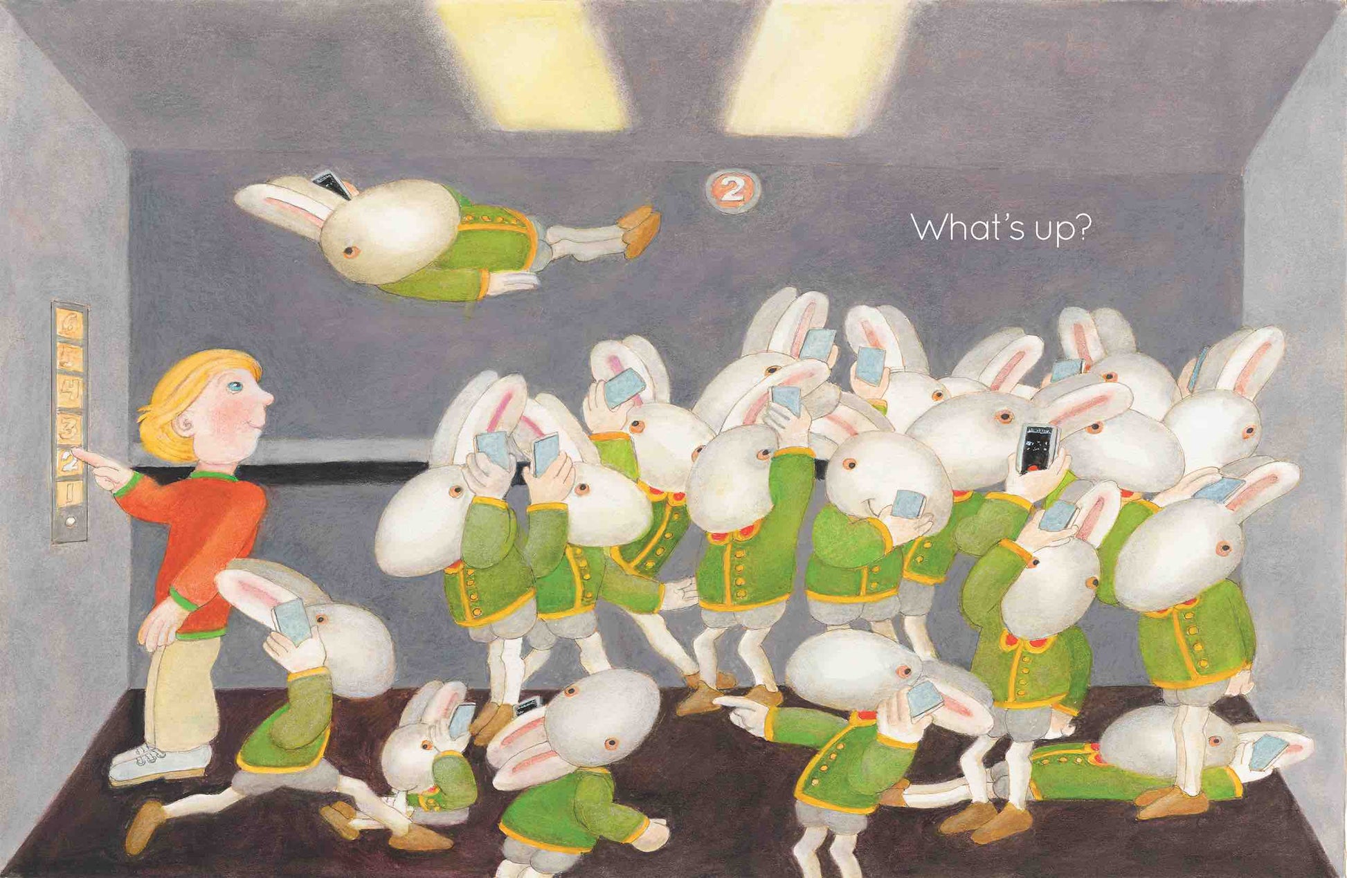 Familiar phrases and unusual characters accompany a boy as he ascends and descends in an elevator.