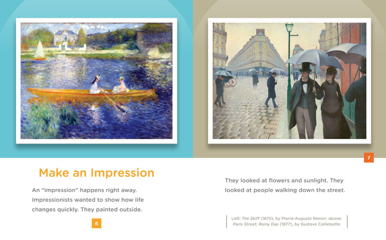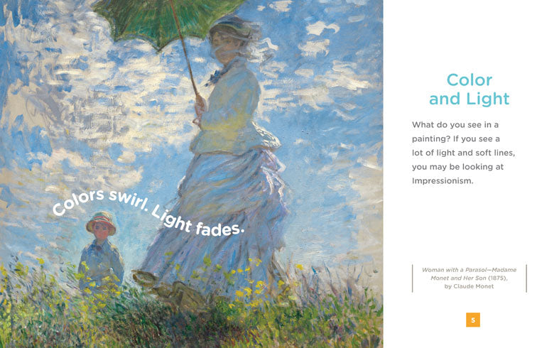 With prompting questions and historical background, an early reader comes face to face with famous works of Impressionist art and is encouraged to identify light and shadow and consider feelings evoked.